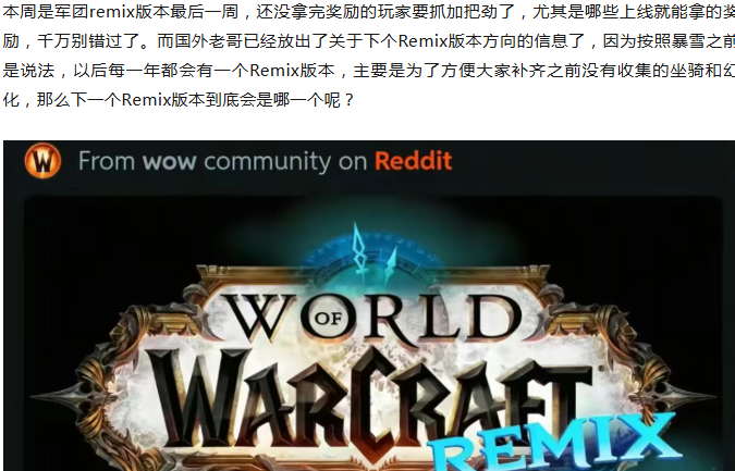 外网传得最多的就是暗影国度Remix,并且连相关的坐骑和幻化也都解压出来了,部分玩家都开始怀疑暴雪是不是已经偷偷在做了,按照目前这个进度的话,最快能在26年9月就能和大家见面了。不过部分玩家对于暗影国度这个版本并不是那么看好,因为从评分上来看暗影国度只有可怜的6.8分,除非remix版本把新能、指挥台、羁绊、导灵器这些统统删干净,否则就算是就是开了Remix也是非常的臃肿。