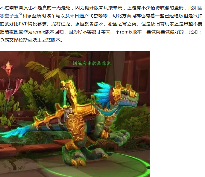 这两个版本之所以呼声高,一个是之前解压包里面已经有相关的坐骑和幻化放出,另外一个是原因这两个版本的坐骑都非常经典,尤其是争霸艾泽拉斯,光是雷龙就有四种不同的颜色,更别说还有狮鹫信天翁这些经典的模型,不管怎么说今年年底之前肯定会有一个remix版本回归,如果是按照解压信息和外网的猜测,最有可能的就是上面三个,当然不排除暴雪临时做出改动,来了一个大家都意想不到的版本。