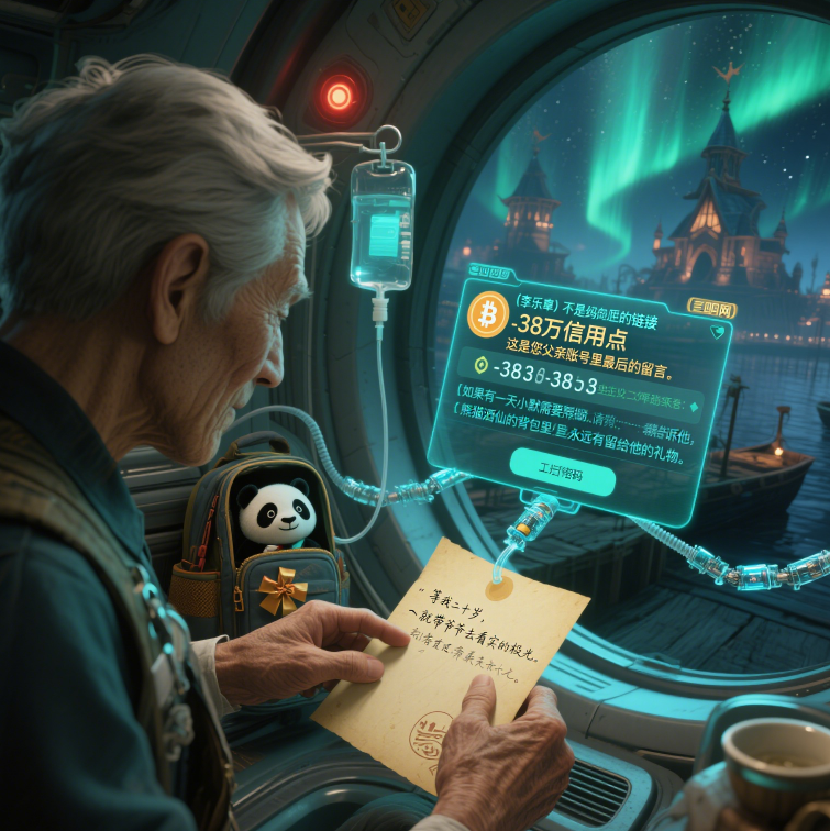 这是李默第三次修改交易协议。他身后是漂浮着淡绿色营养液的生态舱,舱内蜷缩着银发老人,输液管像发光的藤蔓缠绕在枯瘦的手腕上。"爷爷今早又咳血了,医生说…"他的声音突然卡在喉咙里,全息影像微微扭曲,“这个账号…是爸爸留下的最后东西。”