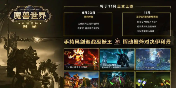 9月23日,暴雪正式官宣魔兽世界泰坦重铸服务器【时光】将于11月上线,为此国服也是提前布局,推出一系列预约活动为时光服造势,玩家完成任务即可获得14格包包、全家宝迅捷的正义之手(物理)和敏锐的比斯巨兽之眼(法系),除此以外,还送一只“泰坦重铸无敌”飞行坐骑。目前看来,时光服就是一个全新的服务器,不能转移WLK角色,没有直升,大家要从新手村1级练起。
