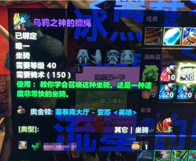 开启后大概率是获取一些合剂和药水,但是也有非常低的概率获取一些以前的五人本掉落的坐骑,就比如该玩家开出来了乌鸦之神的缰绳