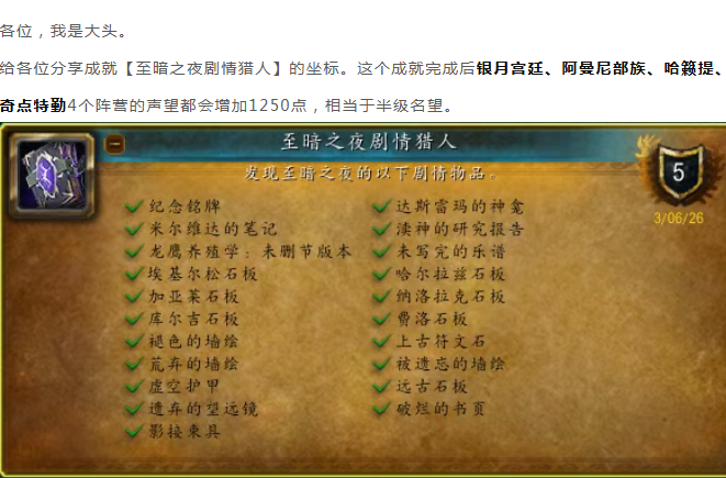 魔兽世界:成就“至暗之夜剧情猎人”位置汇总,每个物品奖励250点声望