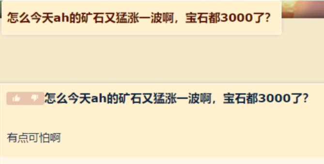 连续几周之后,拍卖行的矿石价格已经连续涨了好多次,从最开始的500到现在的3000,整整翻了6倍,并且需求了还在继续上涨,为什么互出现这样的情况,其实很多简单因为每周四更新,玩家摸了低保要插石头,并且这一周还多个火花,做东西的人更多了,几个就上去了。