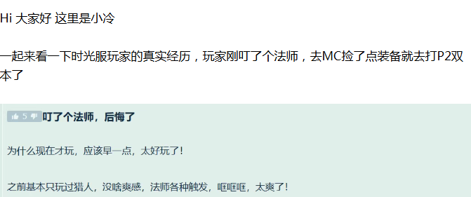 这应该是目前时光服普通玩家最适合练的职业了吧!可以说是最高投入产出比的职业了,装备提升后会明显发现伤害也大幅提高了,要是最近想叮号又不知道叮什么的,玩法师就对了!