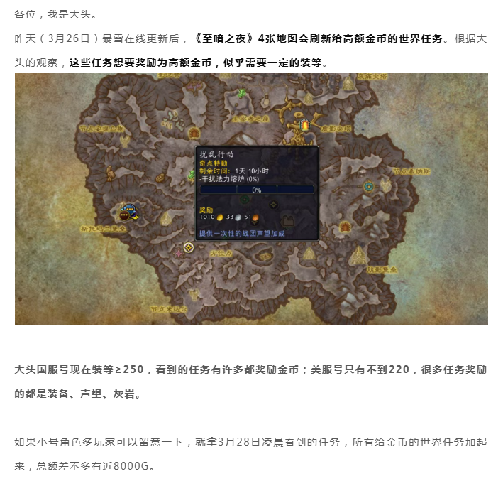 魔兽世界:《至暗之夜》4张地图会刷新高额金币了,但似乎要一定的装等