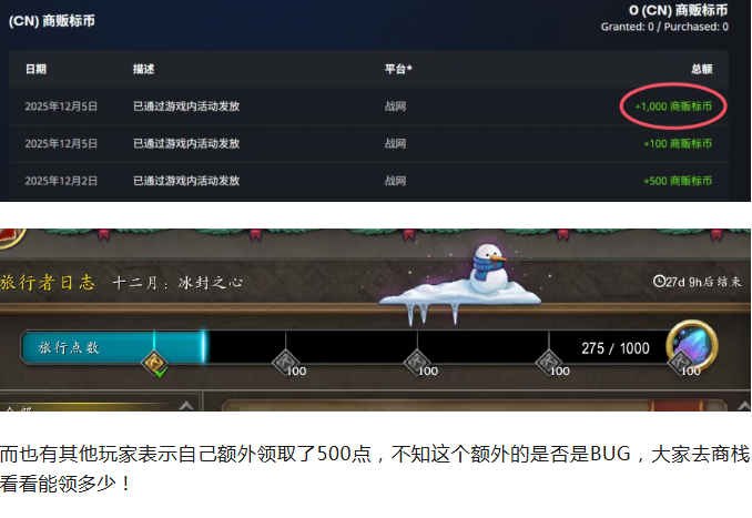 疑似暴雪给我们发的年终奖了!小编去商栈箱子这里额外领到了1000点商栈币。