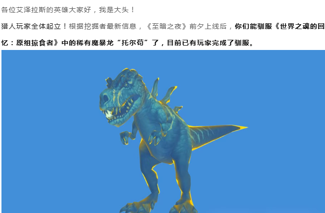 魔兽世界:好消息!至暗之夜前夕期间猎人可驯服黄蓝外观魔暴龙“托尔苟”!
