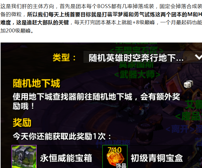 要是还有时间就去打一下大秘境,大秘境依然是现在获取神器能量和提升装备的好途径,每把打完都会获取10+微粒用于合成装备,可以自己开组也可以进集合石。