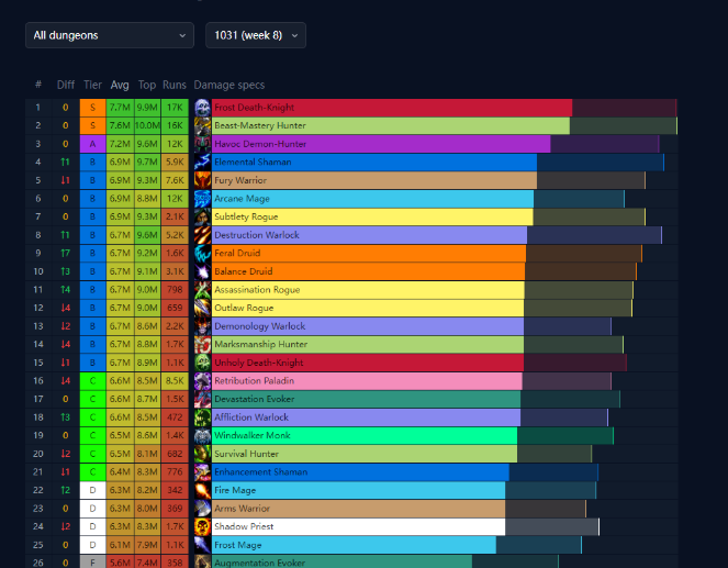 马上新的CD就要来了,下CD会有职业改动,而改动之前的最后一周(第八周)大秘境各职业表现,我们来看看吧。(数据维度14-21层大秘境)