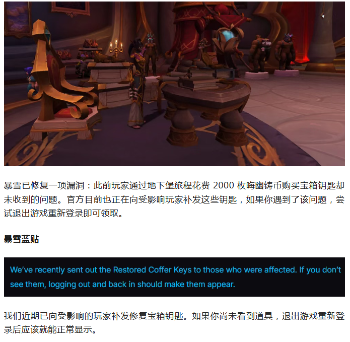 魔兽:暴雪蓝贴!已为受BUG影响没收到地下堡钥匙的玩家补发!