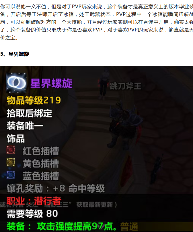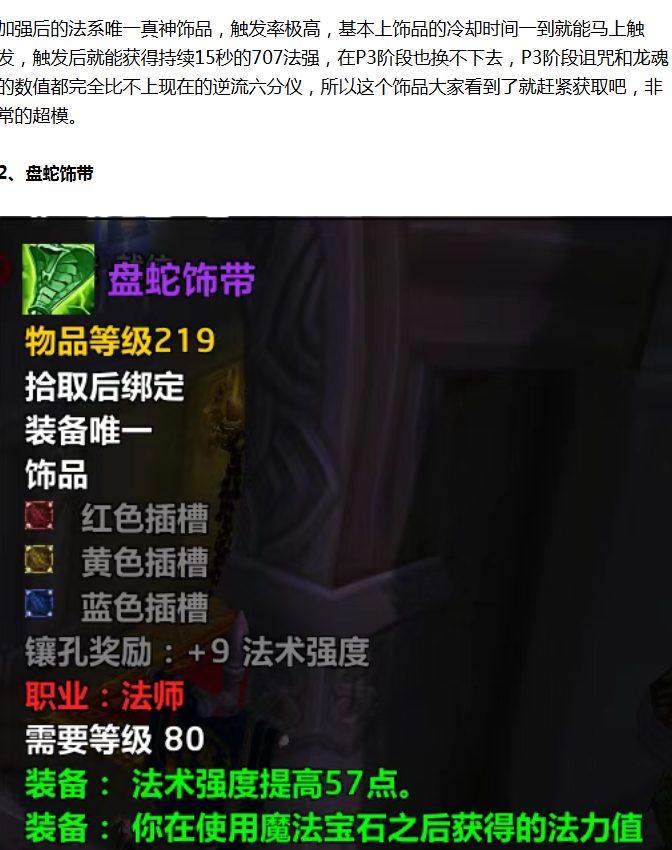 独属于法师的BIS装备,3个插槽+常驻57法强,另外使用魔法宝石后可以获得395点法强持续15秒,一个可以算被动饰品的主动饰品,自己可以控制其什么时候触发效果,最后还赠送了一个读条时可以释放反制的添头,对于PVP玩家来说这个效果不错,可以自己不断条的情况下打断敌方,只能说法师的职业饰品还是太香了,关键竞争还不大,只需要和同队的法师竞争即可。