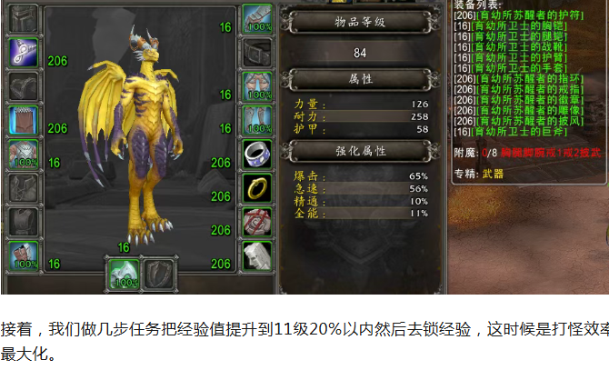 我们来简单打造一个傲天,目前龙希尔种族创建之后会给我们比较强力的初始装备,所以需要用龙希尔:平均装等84,6件206。(注意不要创建唤魔师,建议直接创建战士)
