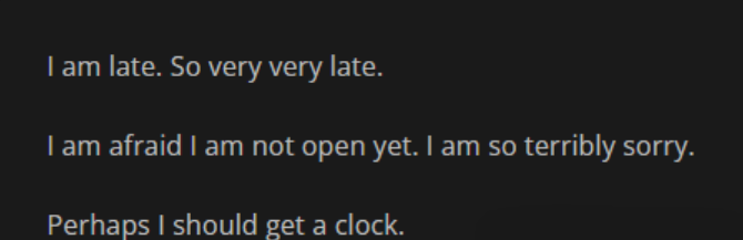 “我迟到了,非常非常迟……恐怕我还没准备好开张,对不起……也许我该去买个钟。”