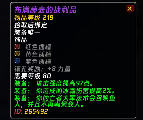 该饰品最重要的作用是使你的亡者大军法术变成召唤鱼人,而且不再嘲讽敌人。在当前的熔火之心团本中,DK最苦恼的就是很多Boss都不能召唤大军。例如1号、3号、4号、7号和9号,这些带小弟的Boss几乎都是无法召唤大军,或者要等到只剩下Boss才能召唤大军的,这伤害就少了一大截了。