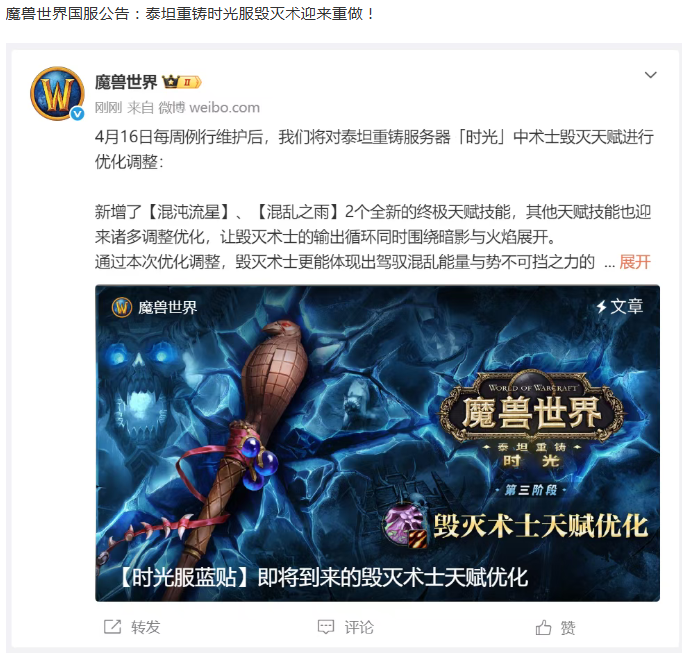 魔兽国服公告:时光服毁灭术迎来重做!军团降临