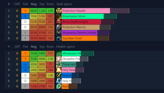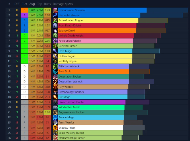 这是魔兽世界地心1赛季第18周的大秘境DPS排行榜,大部分职业的排名几乎不变,惩戒骑往前提升了一个位次,超越了生存猎,这主要得益于惩戒骑玩家对提灯饰品的开发,当然高层最强大的DPS职业依然是元素、增强、奇袭贼、冰DK冰法和平衡德。