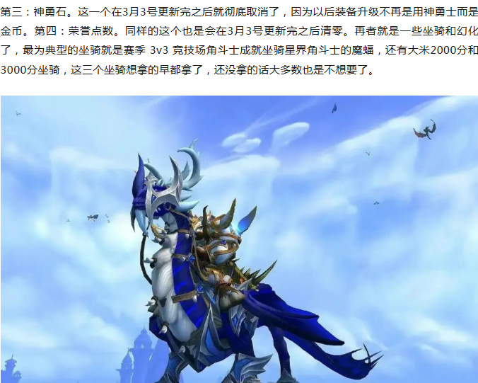 上面提到的坐骑就是在12.0前夕就绝版,而在3月3更新之后还有一批坐骑也会绝版,那就是H难度团本尾王任务 "暮光誓言的终末" 奖励皇家虚空之翼,并且根据以往的情况来看,这是一个错过了就永久绝版的坐骑。幻化的话有两套比较经典的,一个是S3赛季 PVP 精锐套装另外一个是S3 赛季武器幻象,这两个都是12.0前夕开始后就绝版的幻化。上面就是一些需要特别注意的事情,大家可以查缺补漏,看看有没有遗漏什么。