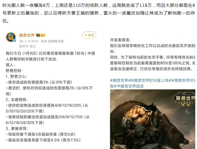 不过第二天就立马进行了削弱,兽王猎三个天赋都被大幅削弱,其中野兽之心:使你造成的伤害提高10%下调到3%,激活时,使你对目标造成的伤害提高10%下调到3%。同时志趣相投和豪猪诱饵也进行了削弱,不得不说卖了一波直升之后,大刀立马就来了本以为能爽一个星期。