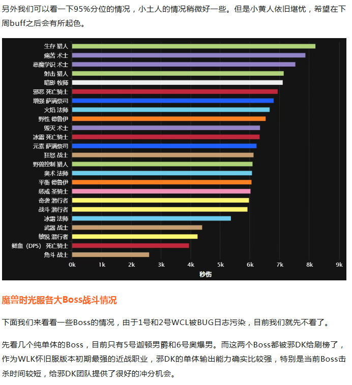 魔兽世界泰坦重铸时光服在本周进行了几个职业的调整,目前在调整之后的各职业排名情况有了些许变动。如果未来WCL对Boss战斗做一些限制的话,整个职业状况可能会有比较大的改变。今天我们先来看看,本周的情况吧!