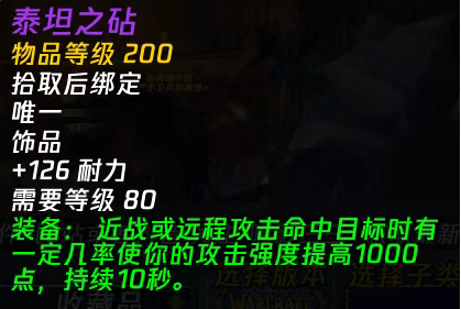 魔兽世界泰坦重铸时光服冬拥湖有一个饰品【泰坦之砧(zhen,一声)】,看起来常驻耐力是T用的,但是触发又是1000攻强。这个饰品猎人玩家初期如果不买卡片的话可以拿来过渡。耐力在生存天赋里也可以加一点点攻击强度。而且这个特效触发比较靠谱一些,不需要爆击。