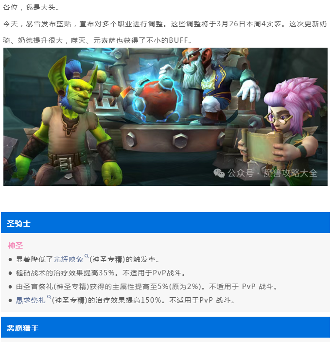 魔兽世界:将于3月26日到来的职业调整、奶骑、奶德等专精提升很大