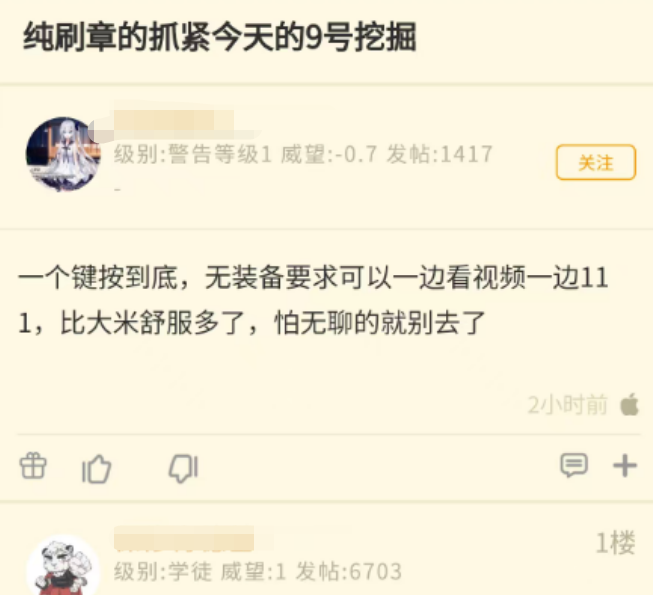 不用打大米也能无限刷鎏金了,解除鎏金上线之后很多玩家去打大米刷鎏金,但是一些小号进组有点困难,所以这里推荐大家一个小号也能无限刷的办法。可以直接去9号挖掘,完全不看等级不堪装备,前三次7镀金15符文,藏宝图20,之后一次15符文。