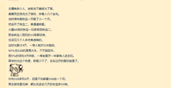 买了时光服528礼包的成小丑?最近论坛突然出现了一些言论,那就是买了时光服528礼包的玩家成小丑了,直言充值528回不了本。但是这玩家忽略了一个很重要的事情,那就是提前体验之前528礼包中的其中一个内容,抛开这个不说也有等价528的道具了,还有就是提前体验并不一定是为了吃排骨,只是想早点玩到,所以没有所谓的亏本和赚翻,只有愿不愿意。