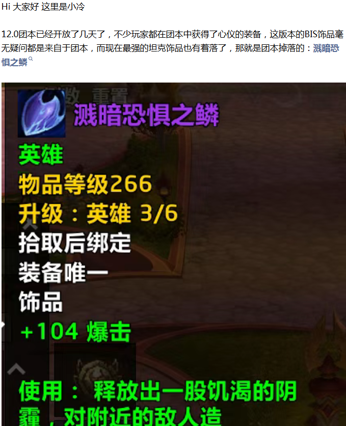 【魔兽世界】12.0唯一坦克饰品!开启后可获得100万护盾,攻防一体的BIS饰品
