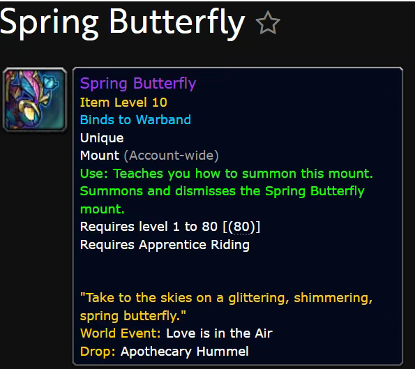 魔兽世界12.0PTR最新客户端中,Spring Butterfly(春日彩蝶)坐骑已经被确定为第三只情人节坐骑。目前该坐骑的来源标记为世界事件情人节时期的Boss掉落。