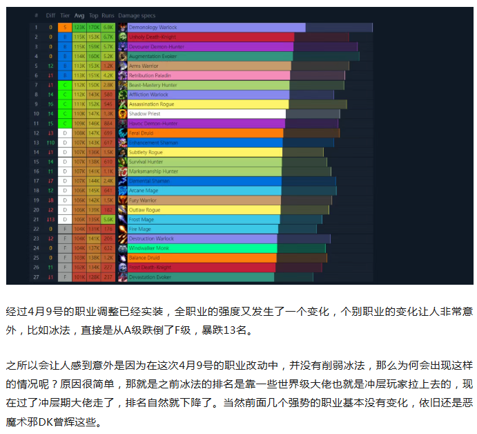 魔兽世界:4月10号全职业强度出炉,冰法暴跌13名
