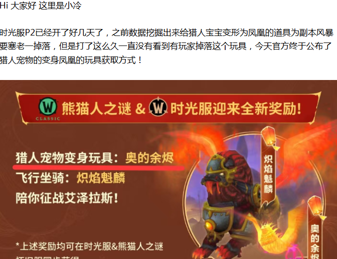 【魔兽世界】悲报!时光服猎人凤凰宝宝获取渠道公布,不能通过副本获取了