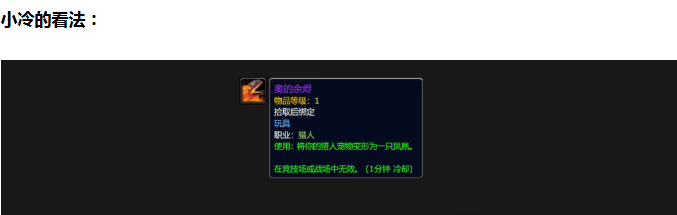 早在20天前在熊猫人的服务器上就挖掘到了奥的余烬玩具,所以官方将该玩具的获取方式设置为抽奖也在意料之中,之前外服的玩家还在猜测这个玩具的获取是和周年服有关,现在看来其实就是和时光服的联动奖励,凤凰坐骑一直是无数玩家最喜欢的坐骑,而凤凰宝宝只是独属于猎人宠物的一个变身玩具,那么你愿意为这个凤凰宝宝买单吗?欢迎在评论区分享你的观点