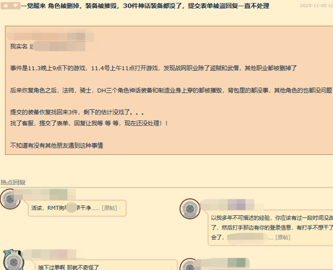 论坛有有位玩家向网友求助,自己一觉醒来角色被删,装备全无,本以为会有网友提供一些类似的情况,但是网友看了之前记录发现,这玩家有过RMT行为,所以就觉得出现这样的情况很正常,尤其是rmt之后不改密码,很容易就被其他玩家上号然后毁号。