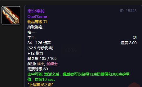 奎尔塞拉有着2.0的偏快攻速,非常适合防战,秒伤高达52.5,外加12耐力。特效是有几率获得13点防御值和300点护甲值,这个小BUFF还是挺强悍的,能大大增加MT的硬度。