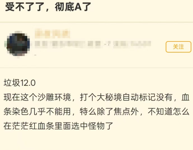 近期论坛出现了一个热帖,一位玩家吐槽自己玩了几天12.0前夕版本然后受不了就选择了AFK,但是底下的评论全都是支持的,但是支持的不是发帖者而是魔兽,因为每个版本的前夕版本都是用来测试各种BUG,以及让大家拿几个坐骑,并不是真正的版本内容,所以抱着体验的心态就可以了