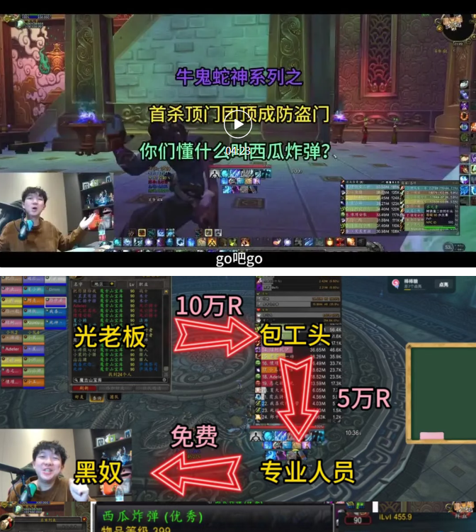 来自@烤培根飞飞飞的视频,这个团从早上7点顶门开打,打到中午一直灭四号未果。然后就去打世界Boss提升,回去魔古山后顺利击杀4号Boss。然后5号Boss伊拉贡又花了3小时开荒。最后老板坐不住了,说我们这不是抢首杀,而是磨首杀,磨到天黑总能打完的,一天赚4000块钱。主播打开查询,整个服务器就他们一个团在打,所以真的是无论打多久首杀都是他们了。这时候有人在YY发言,说不知道有工资的事情,看来还有被坑来打黑工的?更令人笑喷的是,其中一位DK说,听说有4000工资,赶紧找回了一个叫做【西瓜炸弹】的垃圾饰品,团里一堆人就穿着蓝绿装来混首杀的。大家可以看一下主播发的视频,确实是笑死人了。