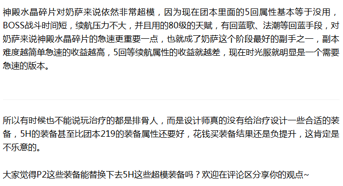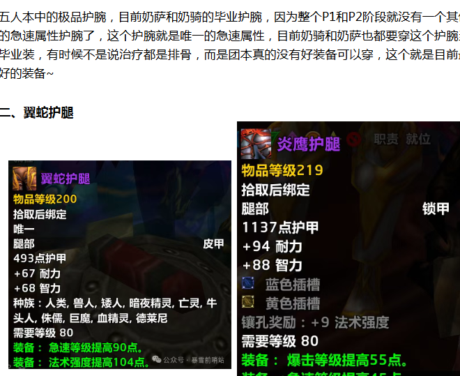 翼蛇护腿也是5H掉落的护腿,其属性对奶萨来说非常超模,因为奶萨就是要急速来加快治疗链的读条速度,因为现在团本的治疗压力小,所以法强暴击收益低,急速收益是最高的,急速低了根本抢不到治疗量,而这个裤子就是目前为止急速最高的一个裤子,219的裤子打满插槽都比不上这个裤子的急速,确实是太超模了。