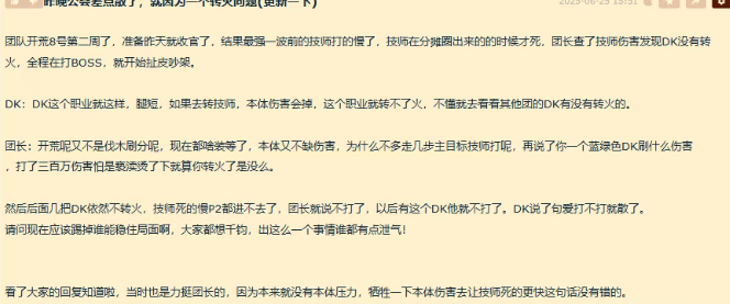 一个转火就可以把整个团都给搞解散,这就是近期论坛非常火的一个瓜。团长在复盘分析的时候发现了队里的DK没有转火一直打BOSS,于是在群里说了这件事,结果直接吵起来了,后面几把的时候DK依旧没有转火,团长就放狠话有这个DK就不打了,最后闹得不欢而散。