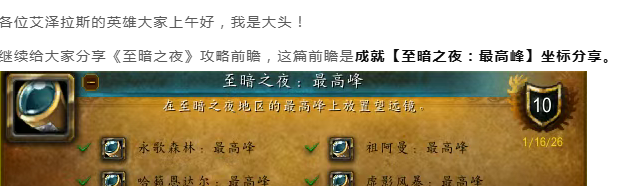 魔兽世界:练级路上白捡声望!成就“至暗之夜:最高峰”坐标汇总