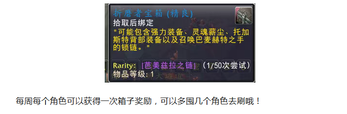 当我们击杀掉折磨者,就会获得一个箱子:折磨者宝箱,从里面就有几率开出坐骑:芭美兹拉之链。