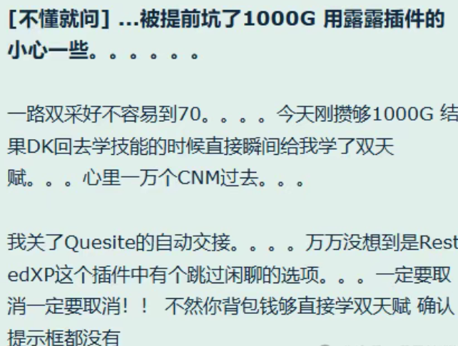 今天来看一下玩家分享的真实案例,辛辛苦苦赚了1000G,结果被插件的功能自动学习了双天赋浪费了1000G!