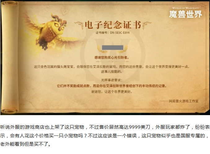 魔兽世界:国服最新慈善宠物来了!外服竟卖9999美刀?!