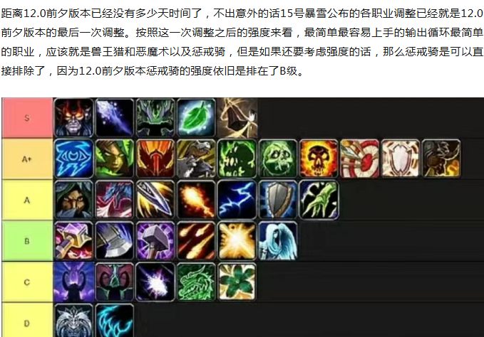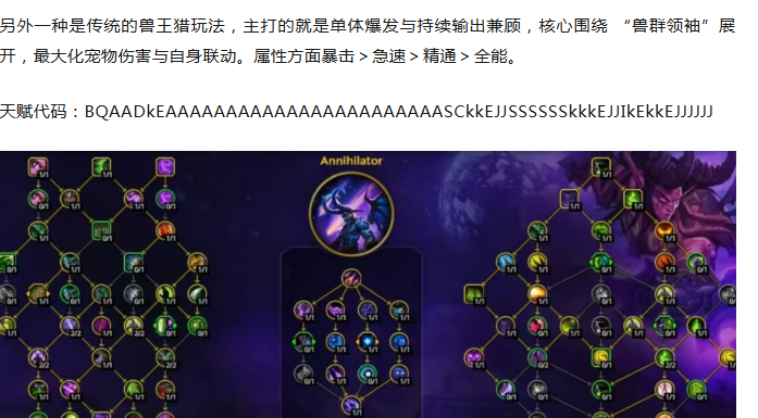 而兽王猎则是排在了A+,并且还是A+靠前的位置,恶魔术则是排在了S级,所以本期就着重和大家说说兽王猎和痛苦术的天赋和属性推荐。开始之前要和大家说一下12.0前夕版本开始之后最高是80级,还没开放90级,所以到时候的天赋点数,通用天赋会少3点,英雄天赋同样也是少3点,专精则是少4点,注意这是所有职业都一样,一直到开了90级之后才能拿满。