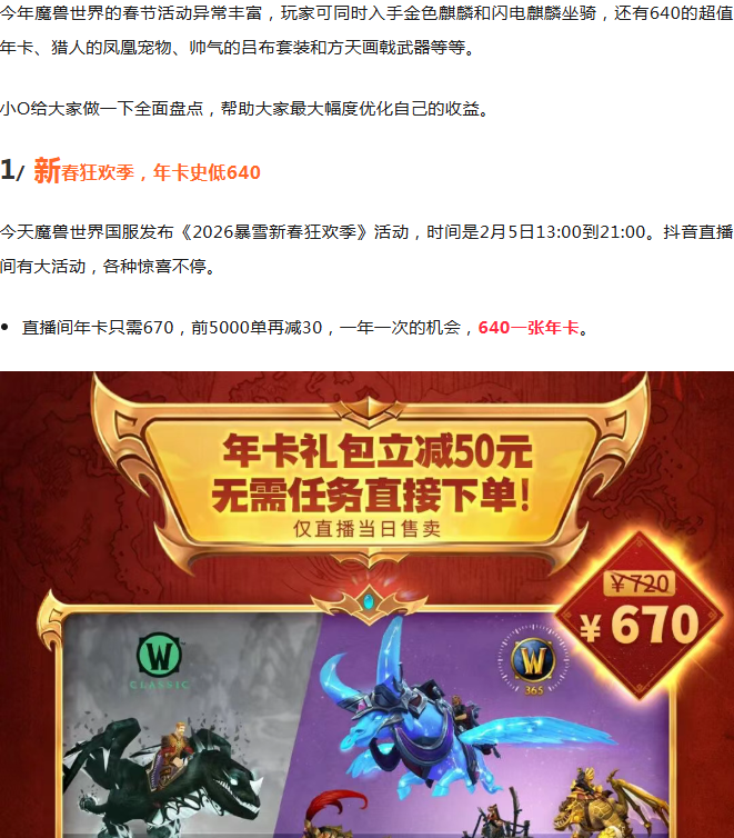 魔兽最强活动来了:年卡史低640!怀旧服直升减100,战网全面打折