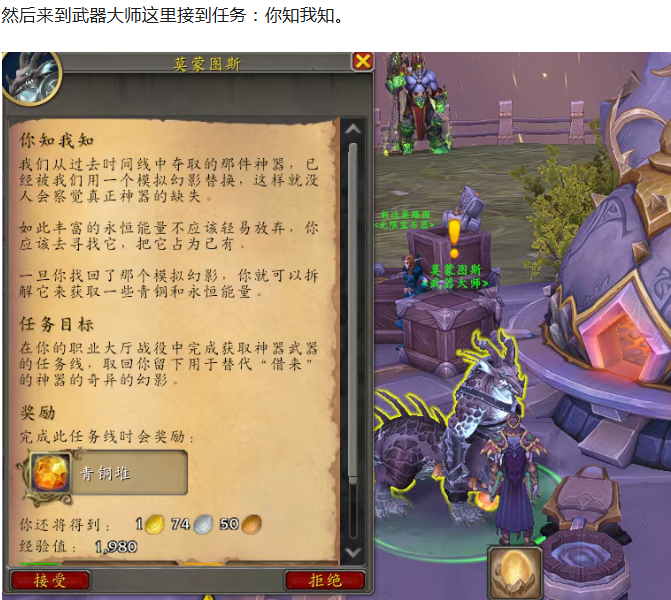 任务要求我们从职业大厅战役中拿到神器,与主线任务可以一起做,奖励我们:完美的纪元纪念品,可以额外获得10%的经验提升,千万别忘记去接。