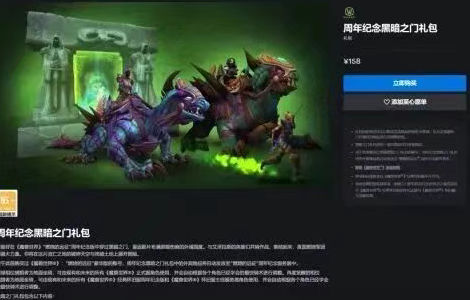 新版周年服礼包<黑暗之门炉石>确认可以带到时光服之前错过的,可以消费了。这个礼包售价159内含两个坐骑和两个玩具。尤其是黑暗之门炉石特效,喜欢的千万别错过。