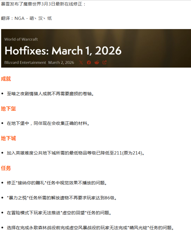 魔兽世界:3月3日最新在线修正