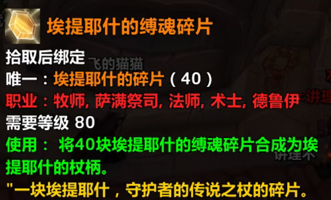 鸡腿杖碎片限定职业为牧师、萨满、法师、术士、德鲁伊,这些可以拿法杖的法系职业,需要收集40个掉落的鸡腿杖碎片来合成鸡腿杖。
