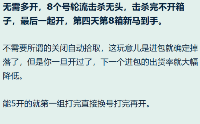 新无头坐骑不知道大家都刷到了没有,最近五开然后一直通过关闭自动拾取的很多玩家都没有开出来坐骑,今天有玩家实测,不需要关闭自动拾取,只需要打完之后不要管箱子,然后换号继续打即可,箱子进背包就自动确定拾取了,但是如果你开过了箱子,那么出货率就会大幅降低。