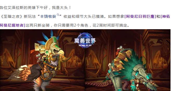 魔兽世界:两角色两周搞定双坐骑,《至暗之夜》休闲玩法“丰饶收获”前瞻